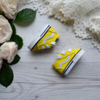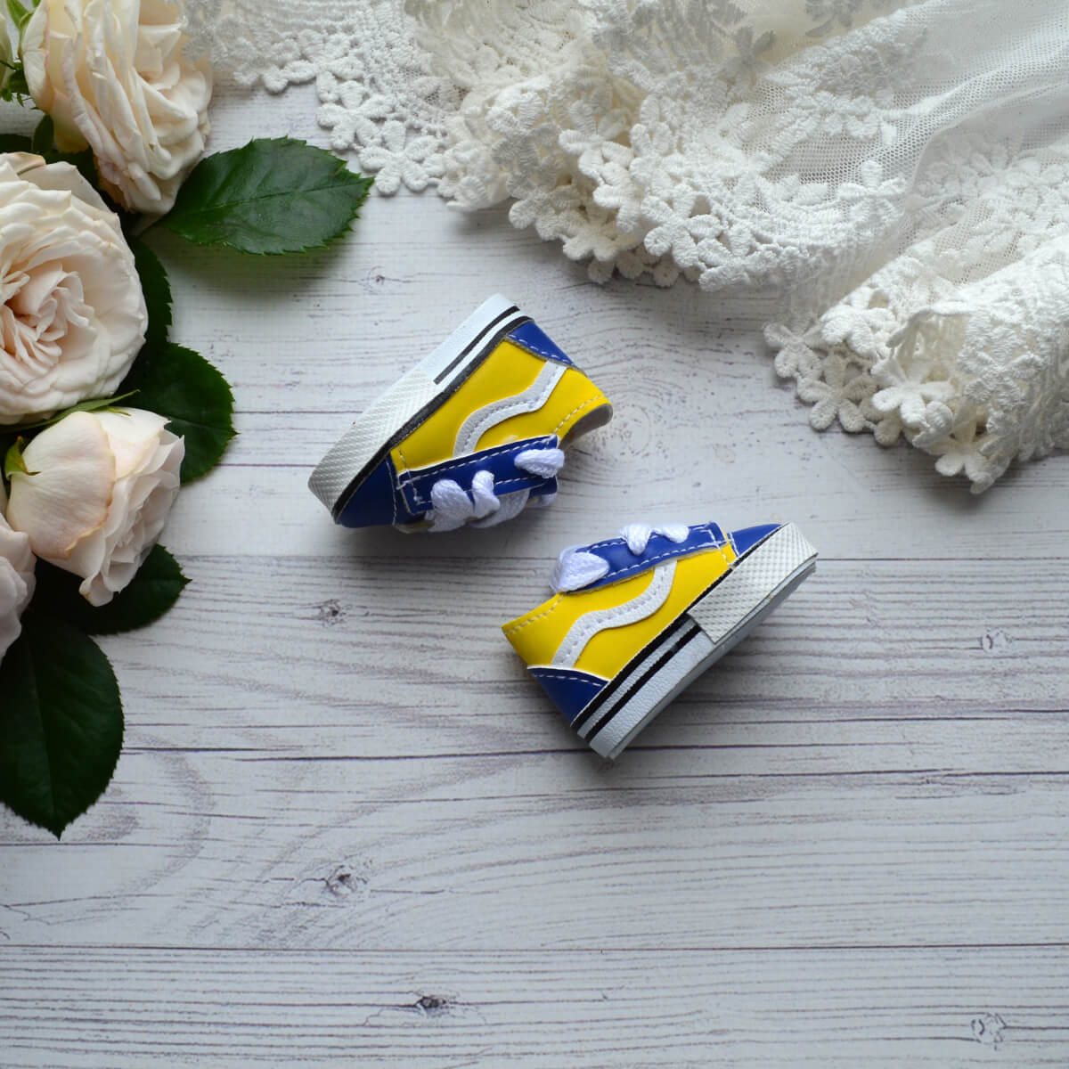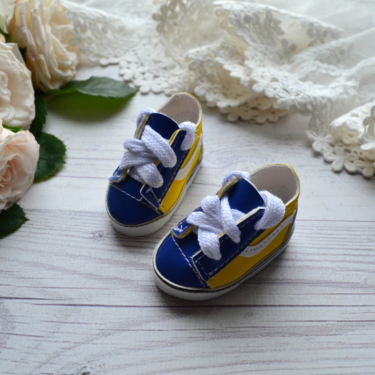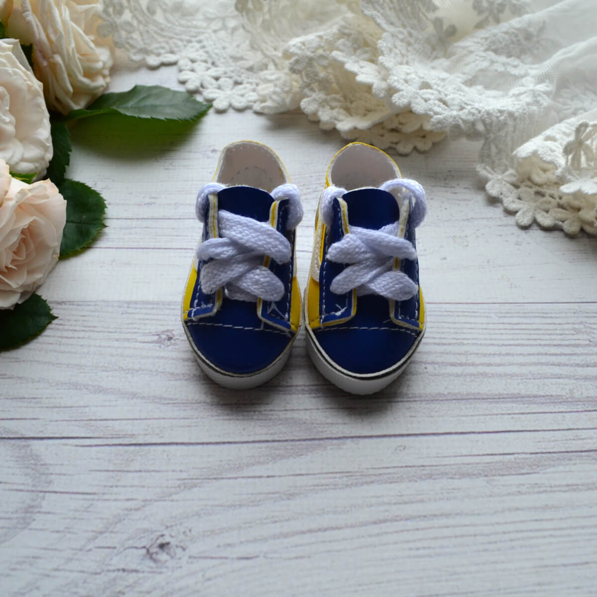 Кеди для ляльок на шнурках жовто-сині. Розмір 5,5 * 2,5 см.