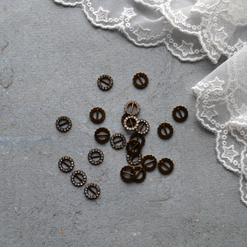 Міні пряжка для лялькового одягу 9*9мм для ременя 5мм бронза зі стразами 1шт. MF008