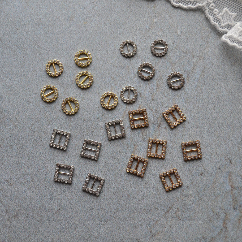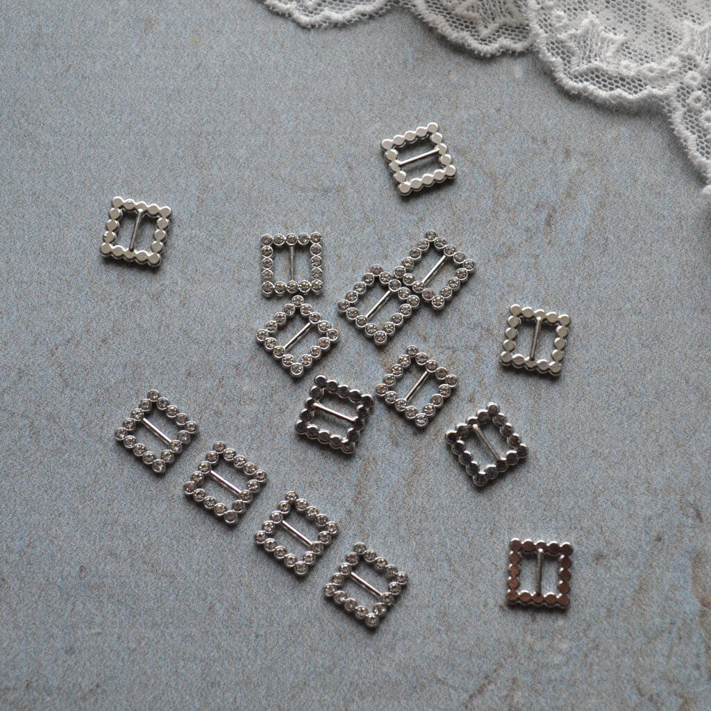 Міні пряжка для лялькового одягу 9*9мм для ременя 5мм срібло зі стразами 1шт. MF006