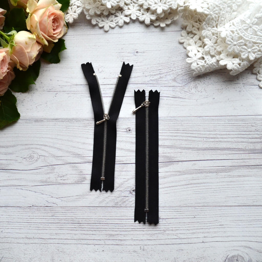 Блискавка для лялькового одягу чорна зі срібними зубцями.