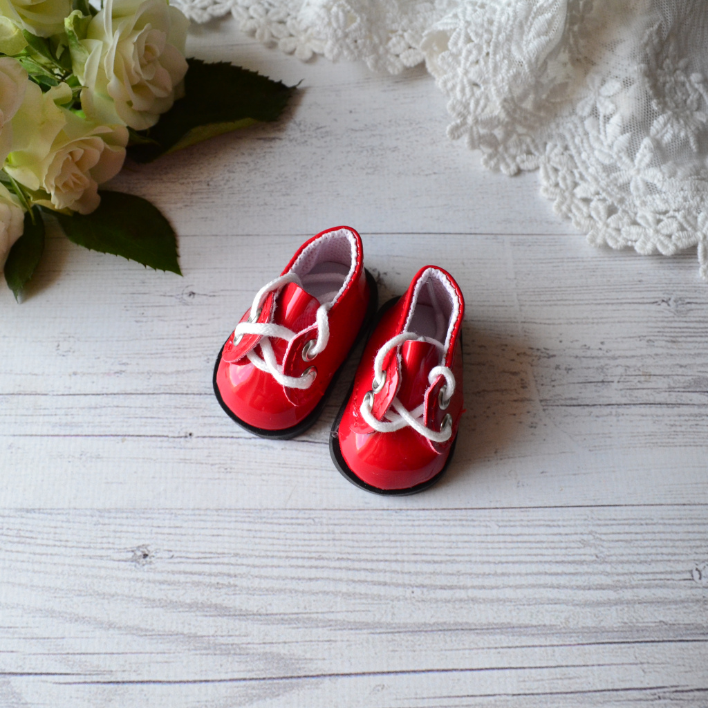 Туфельки для ляльок лакові червоні. Розмір 5,5 * 3 см